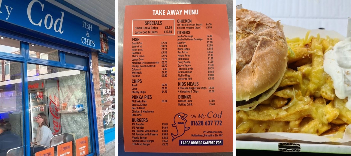 Oh My Cod is a must-visit fish and chips takeaway located in Maidenhead. Known for its magnificent portions and crispy, golden batter, this place redefines classic British fish and chips. With various offerings including fish fillets, scrumptious pies, and even kid-friendly meals, there’s something for everyone. The casual atmosphere makes it great for families or a quick bite after a long day. It generally draws a crowd, especially during peak times, so plan your visit accordingly. Whether you’re dining in or taking away, Oh My Cod guarantees a satisfying meal at an affordable price range of £10 to £20.
